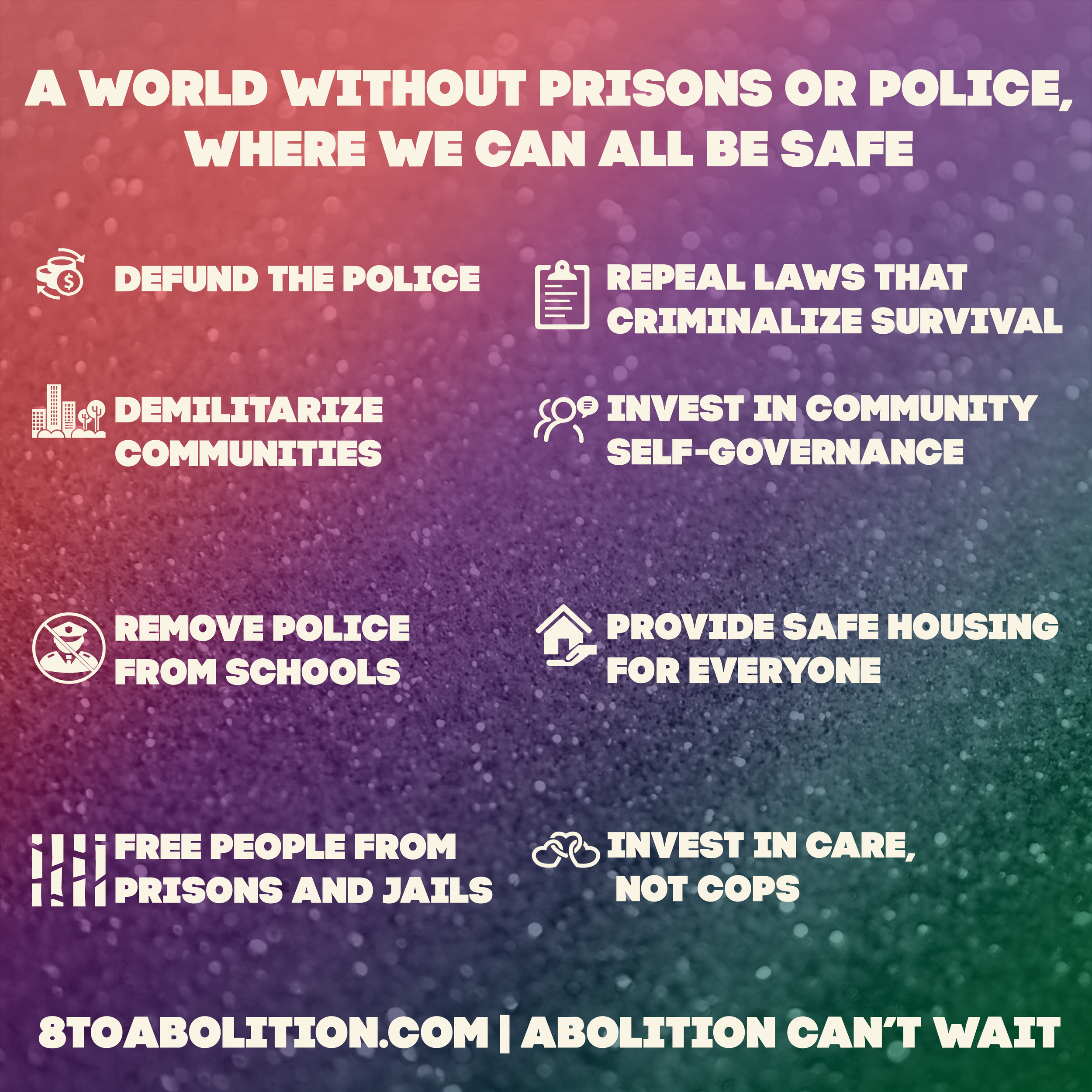The end goal of these reforms is not to create better, friendlier, or more community-oriented police or prisons. Instead, we hope to build toward a society without police or prisons, where communities are equipped to provide for their safety and wellbeing.